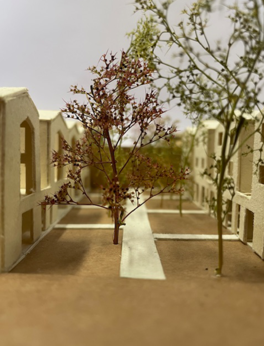 Le long du jardin collectif, une voie d’accès principale dessert les appartements par une entrée au sud, et les maisons par une voie d’escalier au nord. Cette voie permet également de délimiter les espaces extérieurs de chaque habitation et de mettre à distance chaque intérieur. Les logements sont ainsi baignés de verdure, que l’on retrouve aussi en R+1, avec leur terrasse.