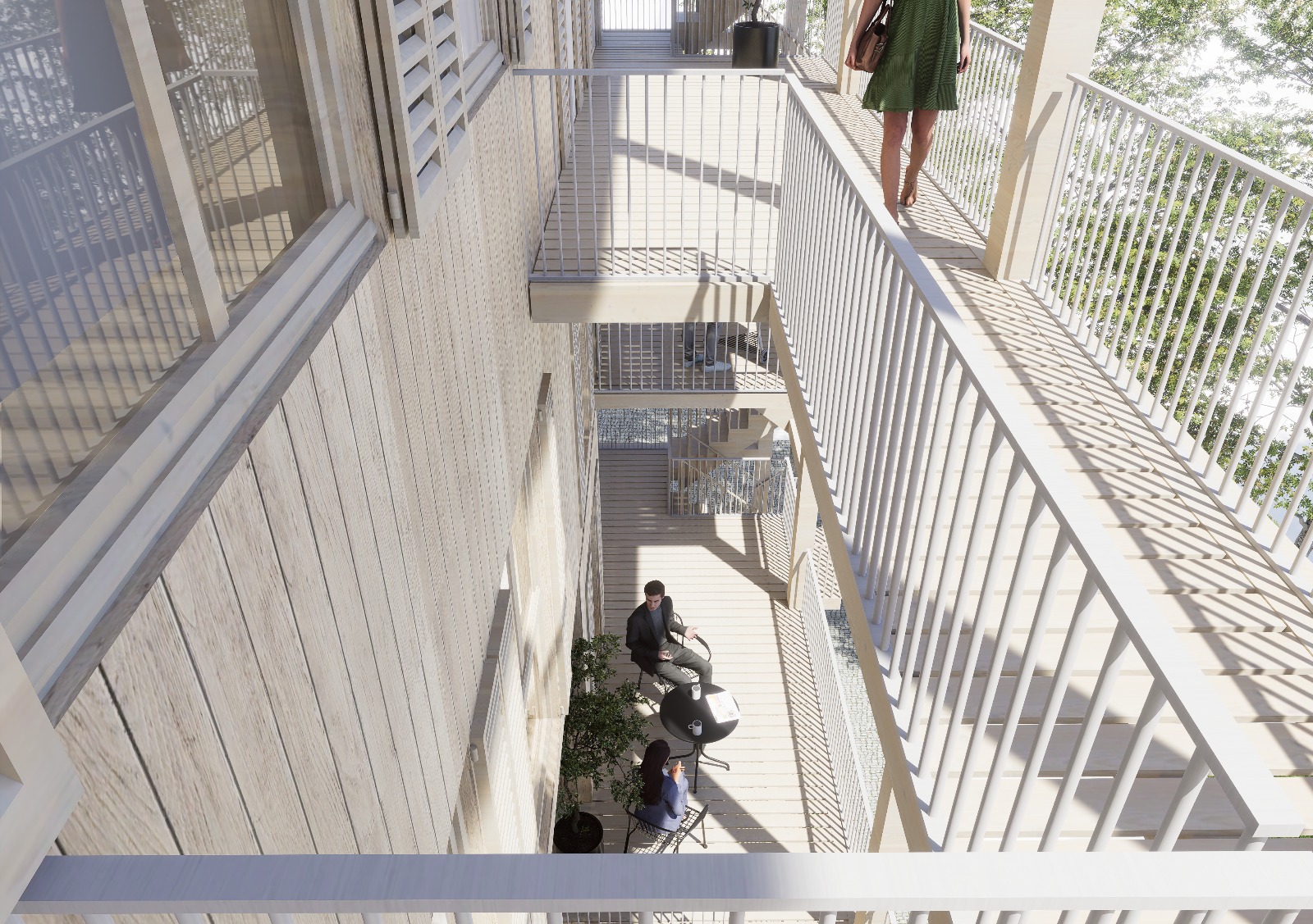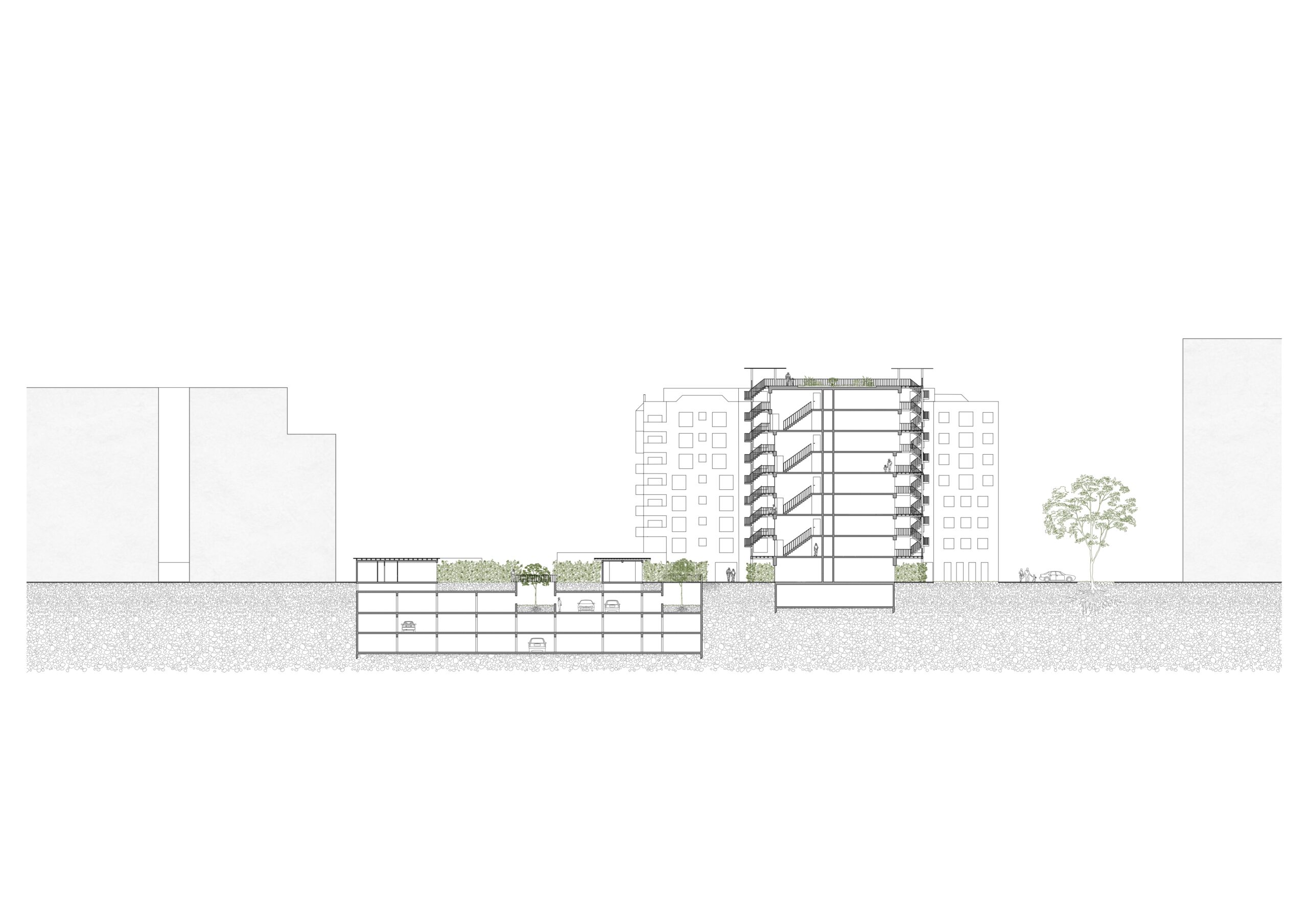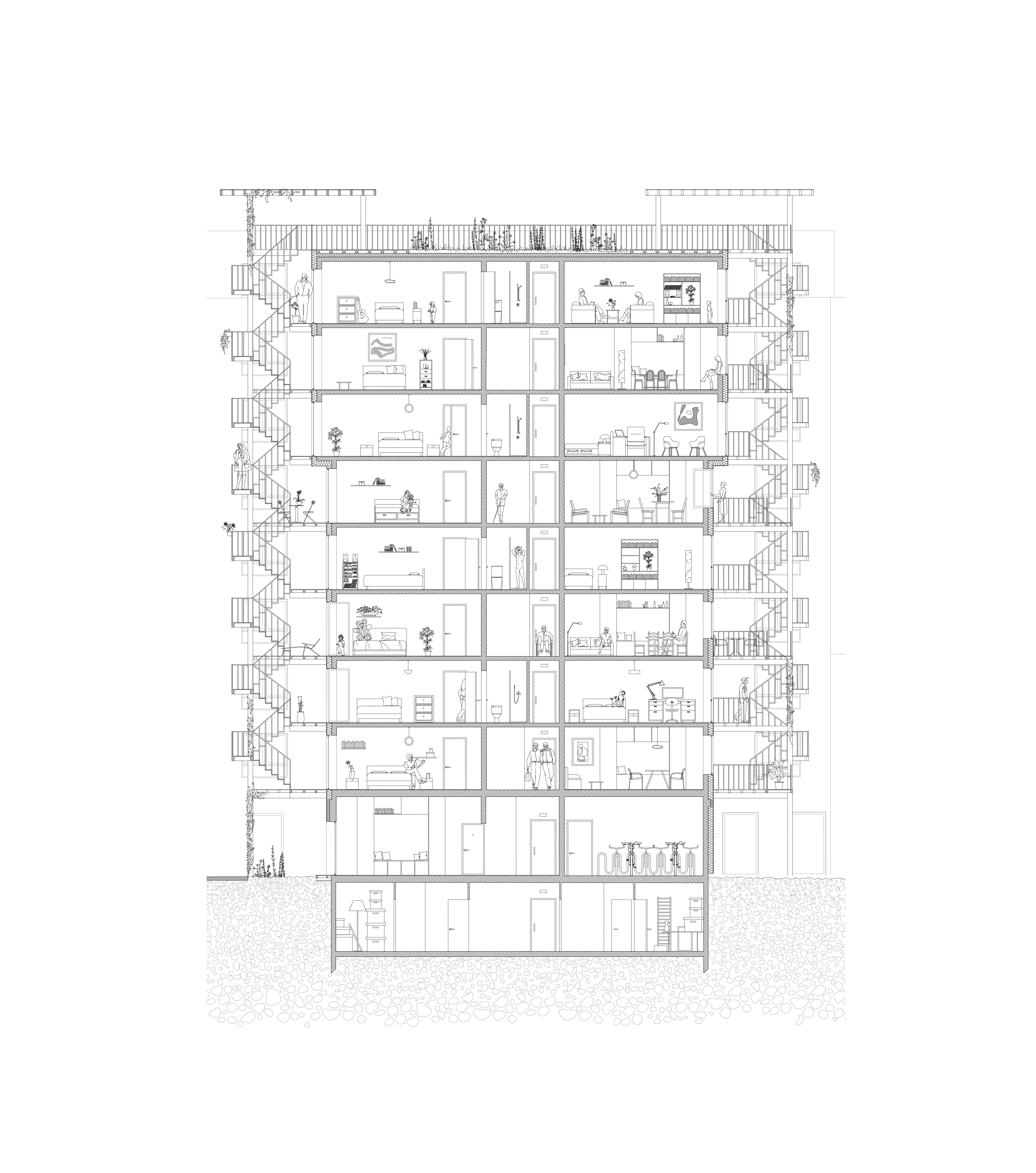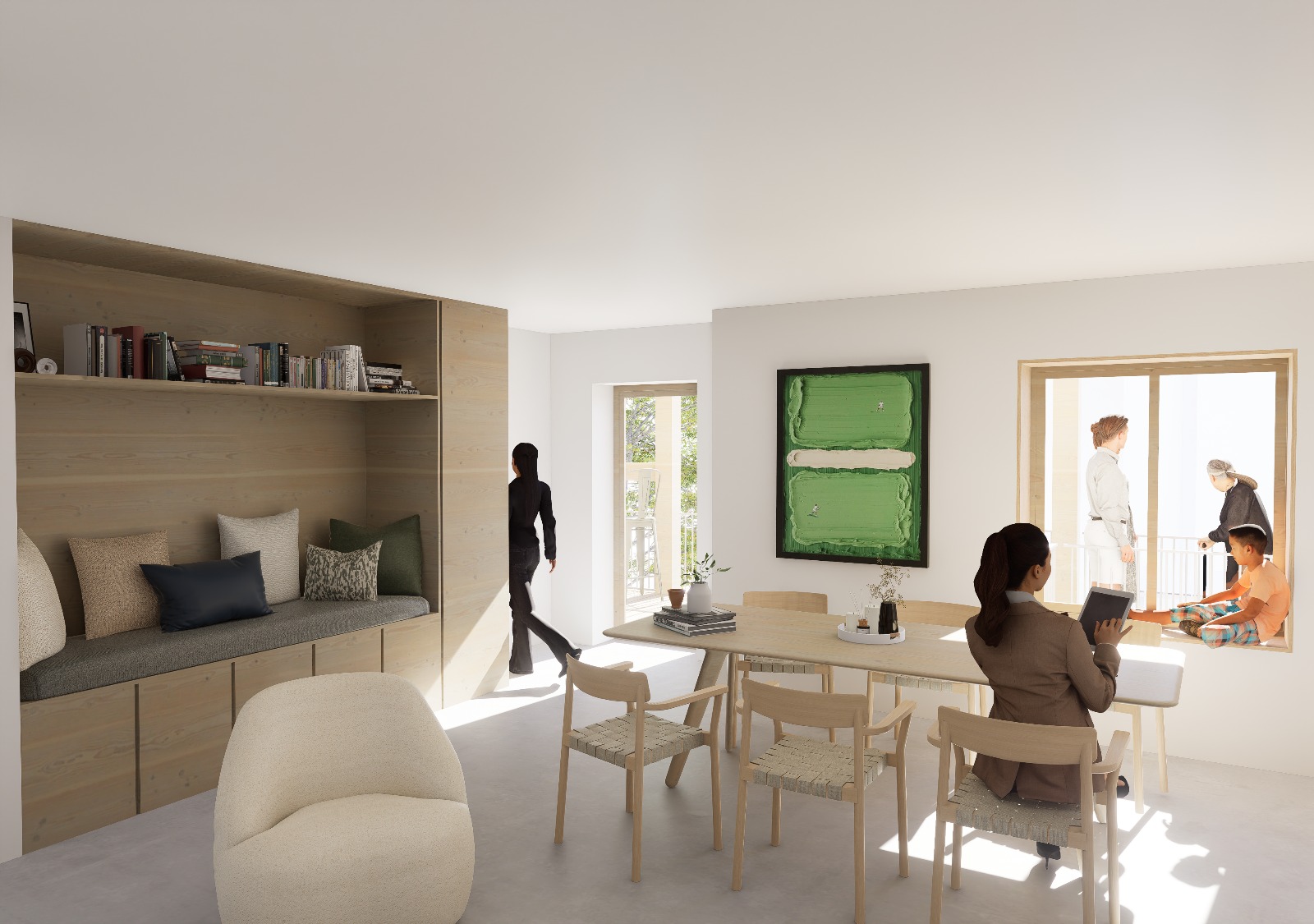 Parcours communautaire est un projet innovant centrée sur l’interaction et le partage. Inspiré du livre Renouveler la ville depuis l’intérieur de Fagart et Fontana, il réhabilite un site des années 80 pour en faire un lieu de vie communautaire. Chaque duplex comprend un logement PMR au premier niveau et des T3 à T5 à l’étage, avec salon et cuisine comme espaces de partage. Une cuisine en double hauteur relie les niveaux par un escalier intérieur, tandis qu’un escalier extérieur et des coursives connectent les étages. Au rez-de-chaussée, l’îlot est repensé pour fluidifier les circulations et requalifier les espaces publics, avec des trémies dans le parking assurant lumière et ventilation naturelles.