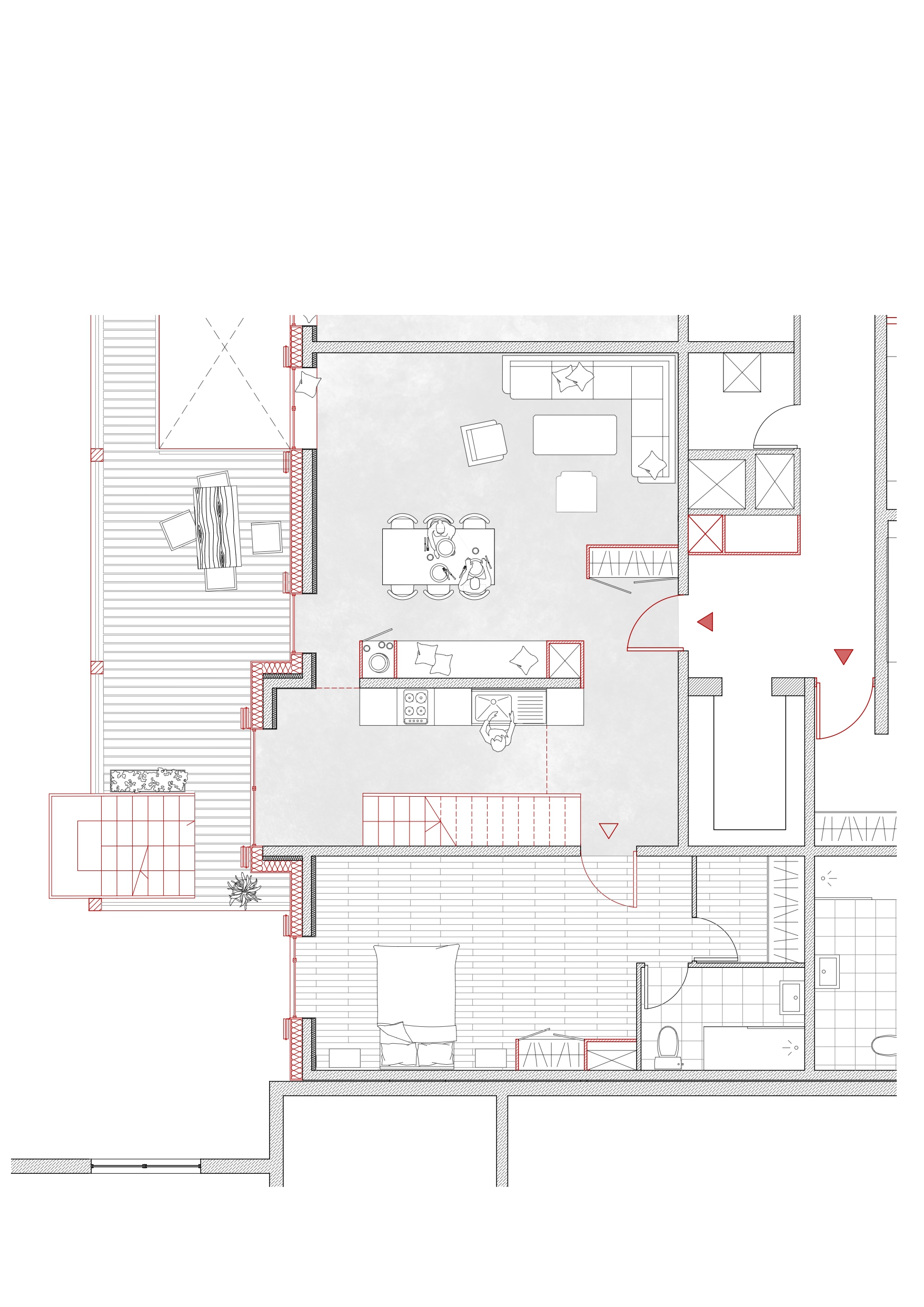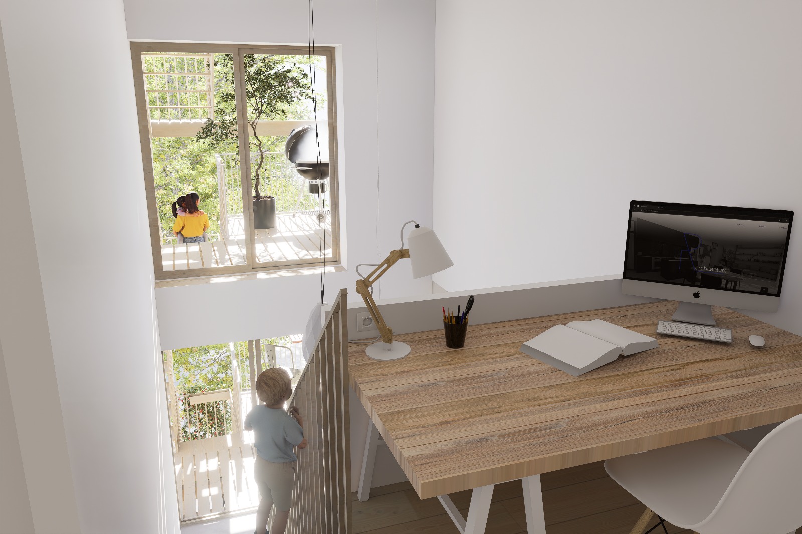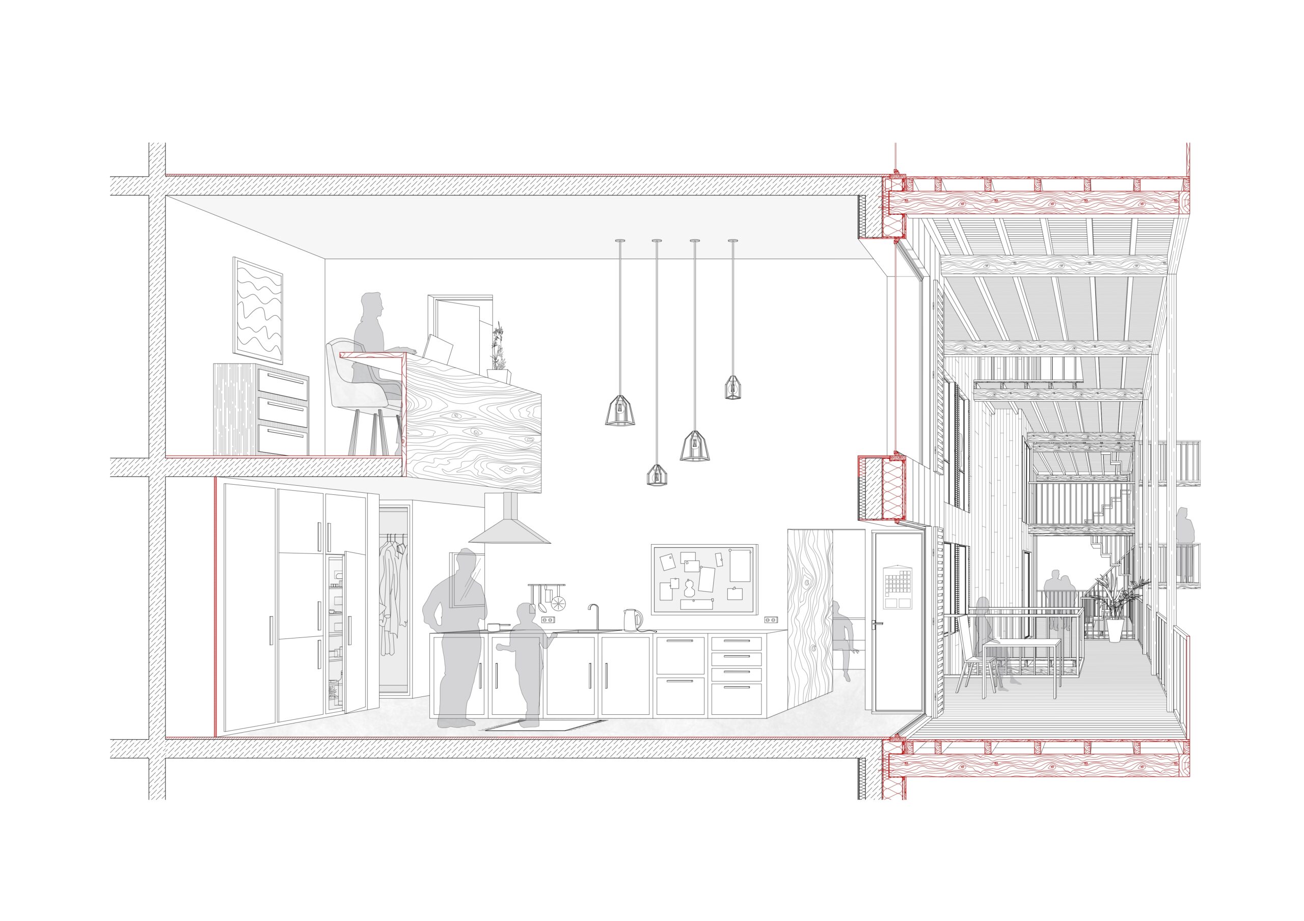 Parcours communautaire est un projet innovant centrée sur l’interaction et le partage. Inspiré du livre Renouveler la ville depuis l’intérieur de Fagart et Fontana, il réhabilite un site des années 80 pour en faire un lieu de vie communautaire. Chaque duplex comprend un logement PMR au premier niveau et des T3 à T5 à l’étage, avec salon et cuisine comme espaces de partage. Une cuisine en double hauteur relie les niveaux par un escalier intérieur, tandis qu’un escalier extérieur et des coursives connectent les étages. Au rez-de-chaussée, l’îlot est repensé pour fluidifier les circulations et requalifier les espaces publics, avec des trémies dans le parking assurant lumière et ventilation naturelles.