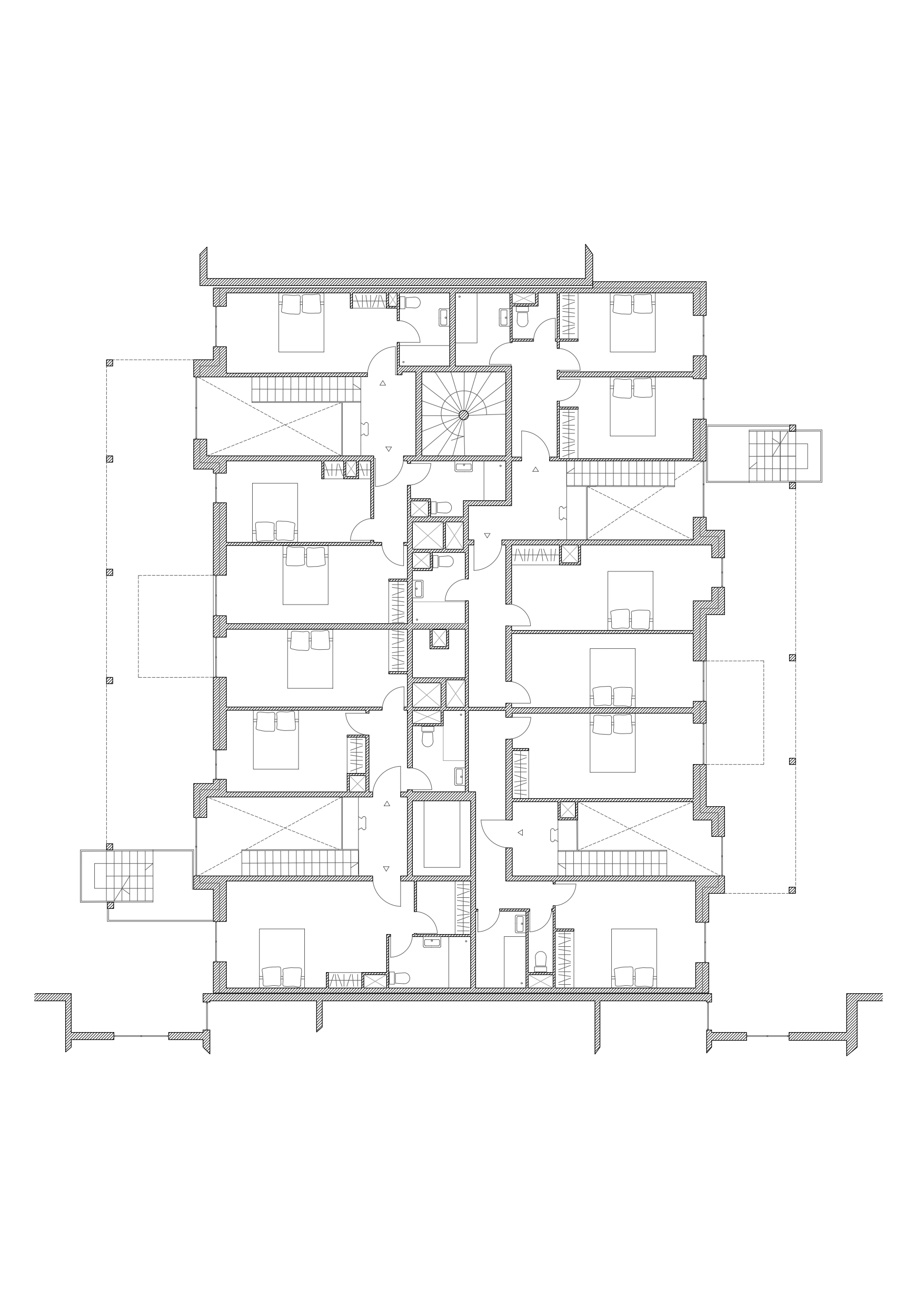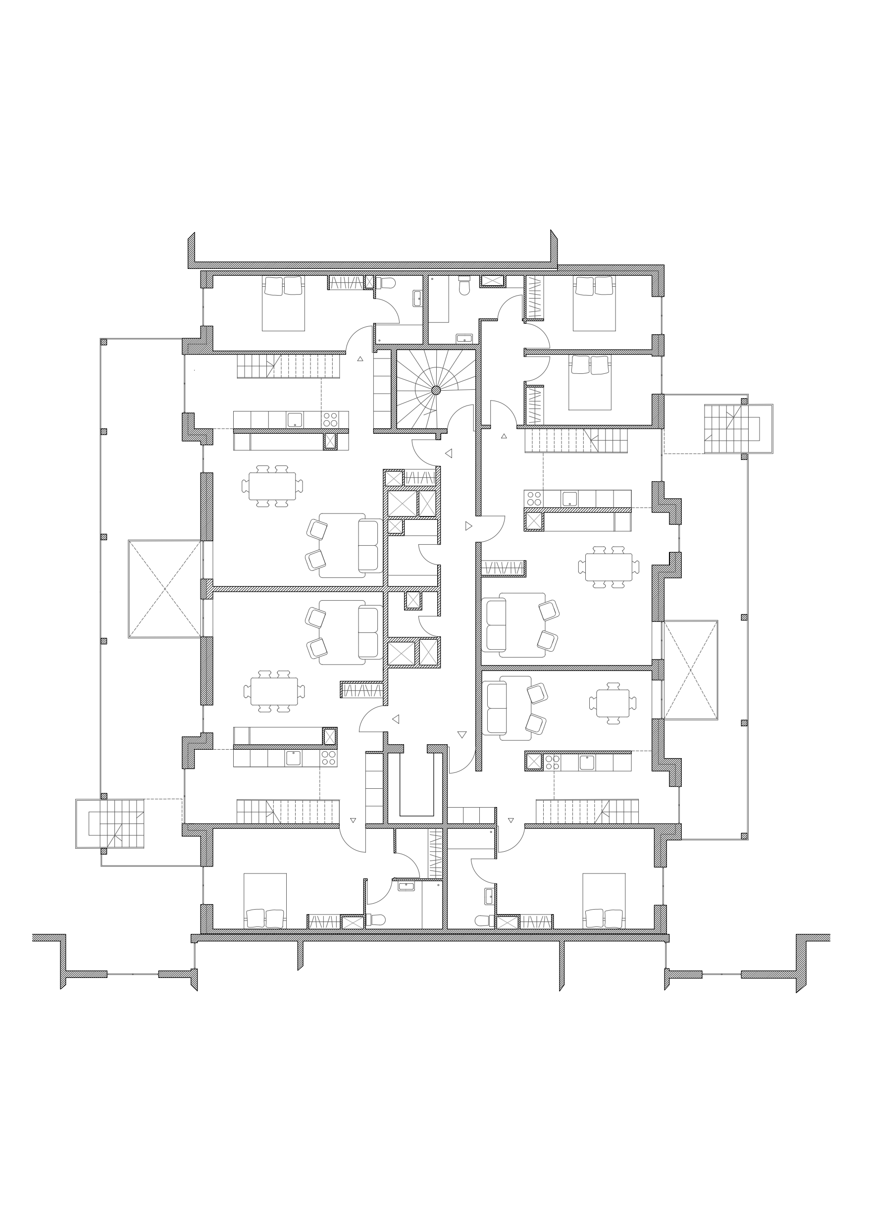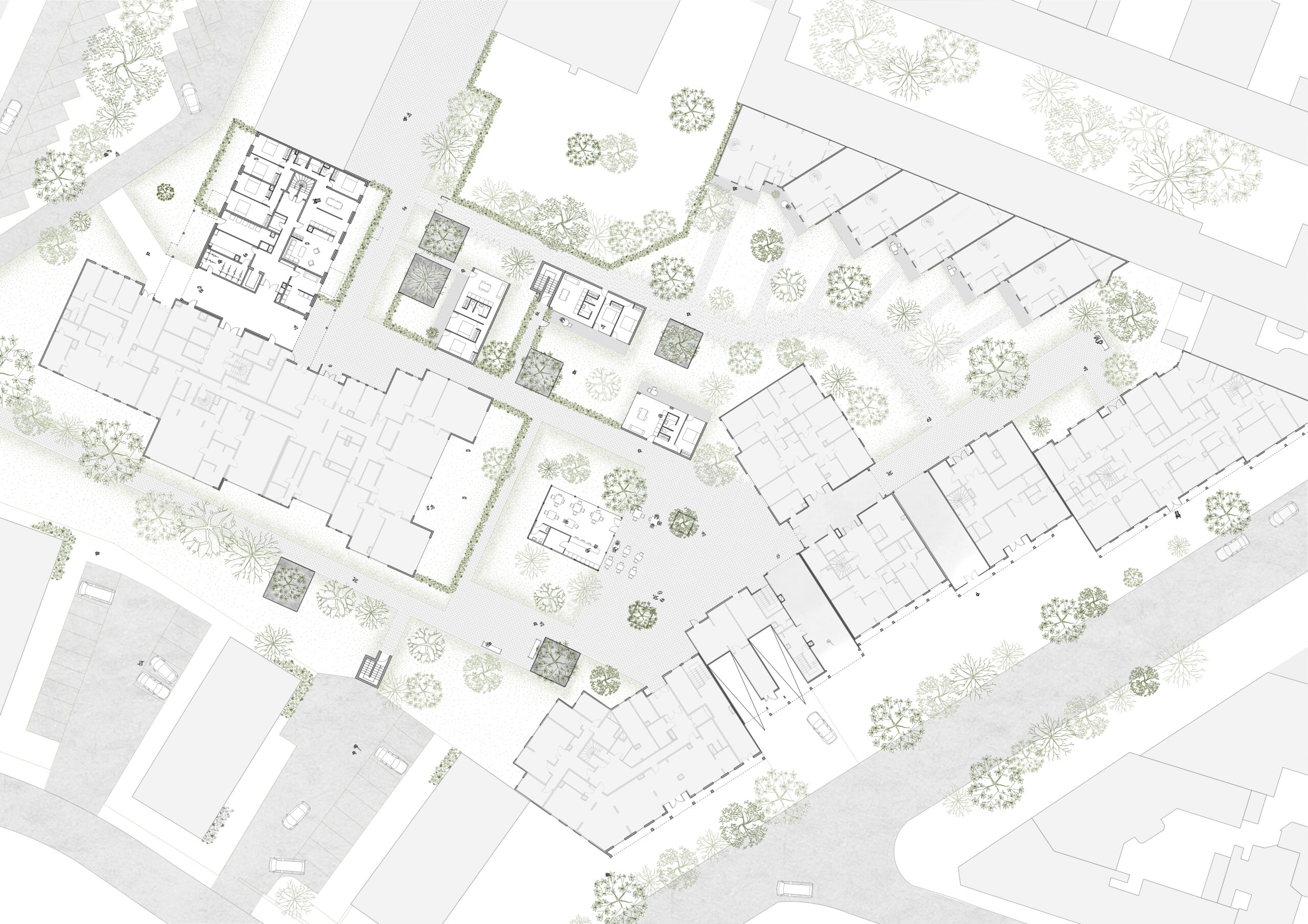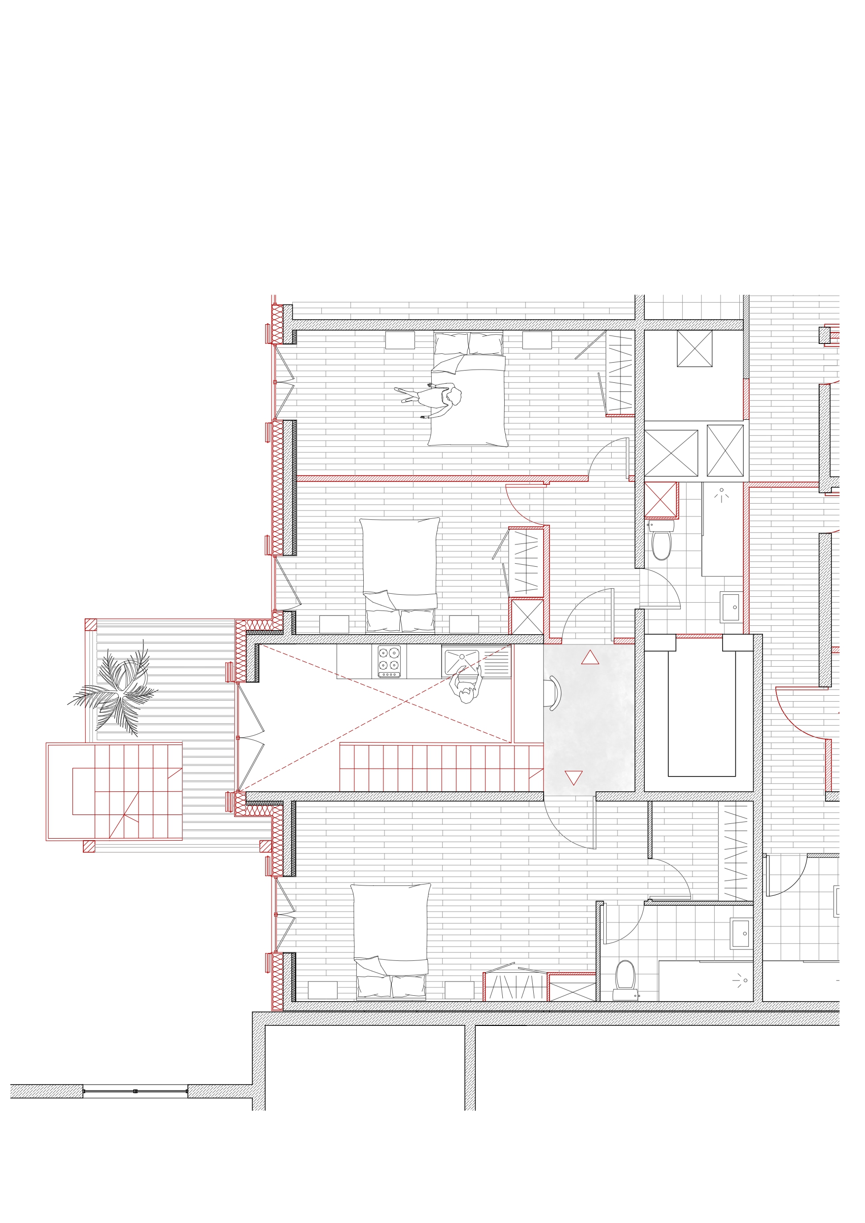 Parcours communautaire est un projet innovant centrée sur l’interaction et le partage. Inspiré du livre Renouveler la ville depuis l’intérieur de Fagart et Fontana, il réhabilite un site des années 80 pour en faire un lieu de vie communautaire. Chaque duplex comprend un logement PMR au premier niveau et des T3 à T5 à l’étage, avec salon et cuisine comme espaces de partage. Une cuisine en double hauteur relie les niveaux par un escalier intérieur, tandis qu’un escalier extérieur et des coursives connectent les étages. Au rez-de-chaussée, l’îlot est repensé pour fluidifier les circulations et requalifier les espaces publics, avec des trémies dans le parking assurant lumière et ventilation naturelles.