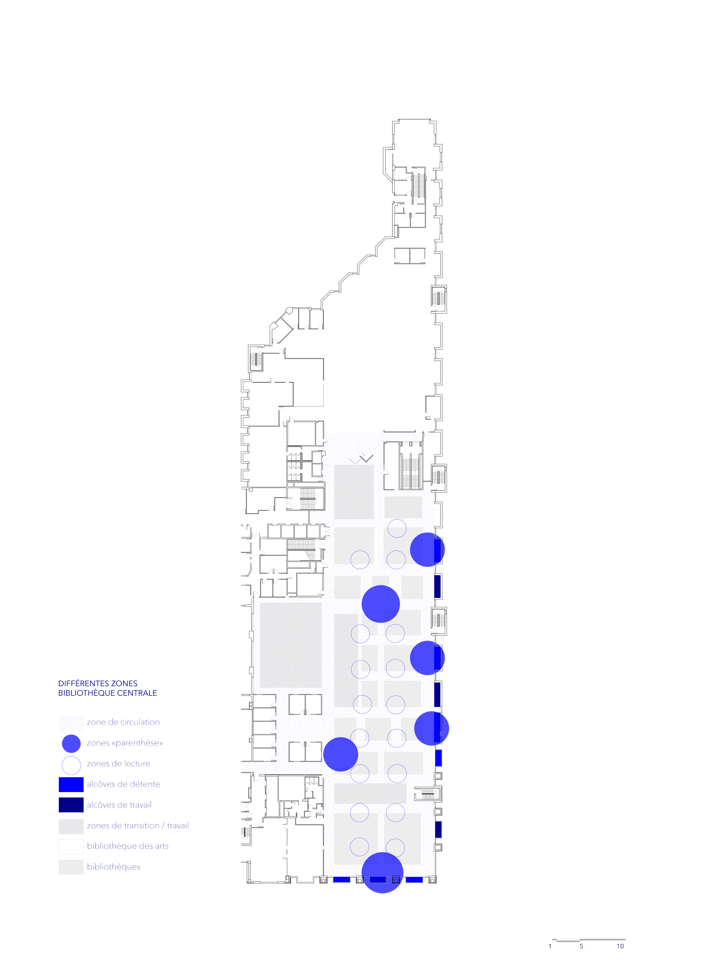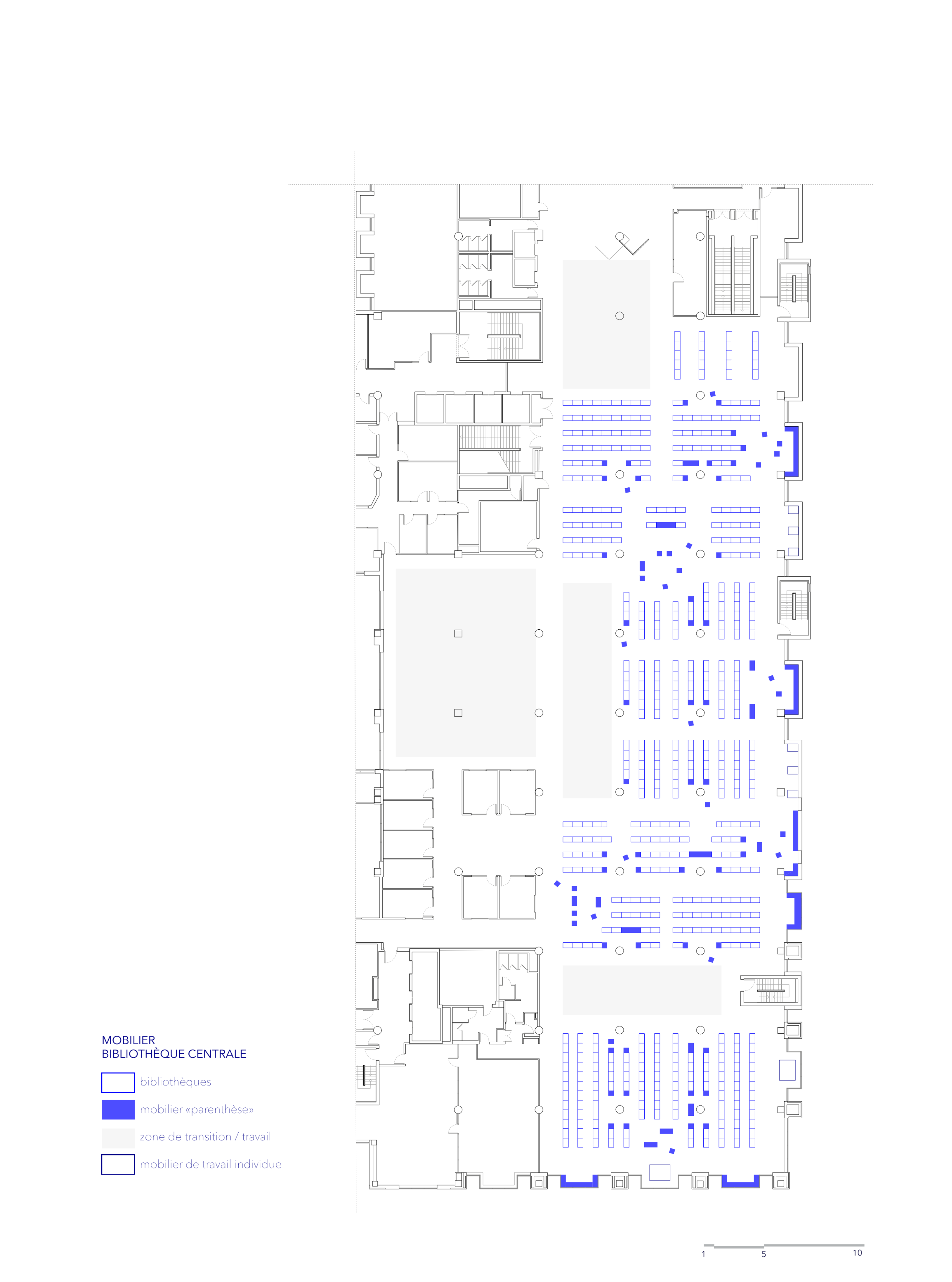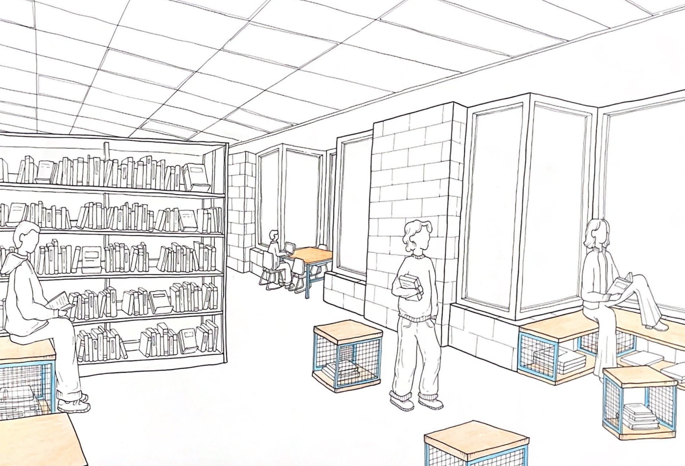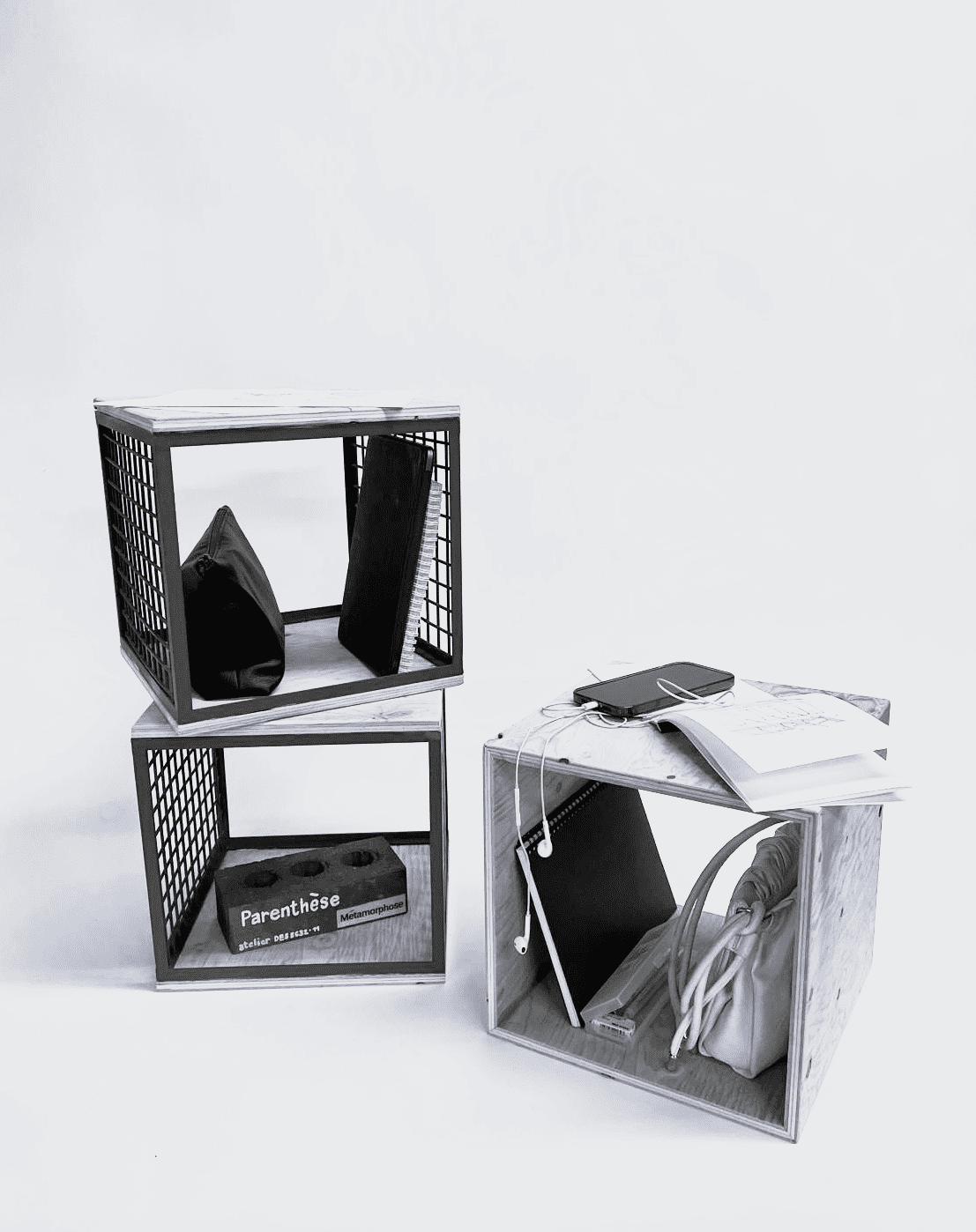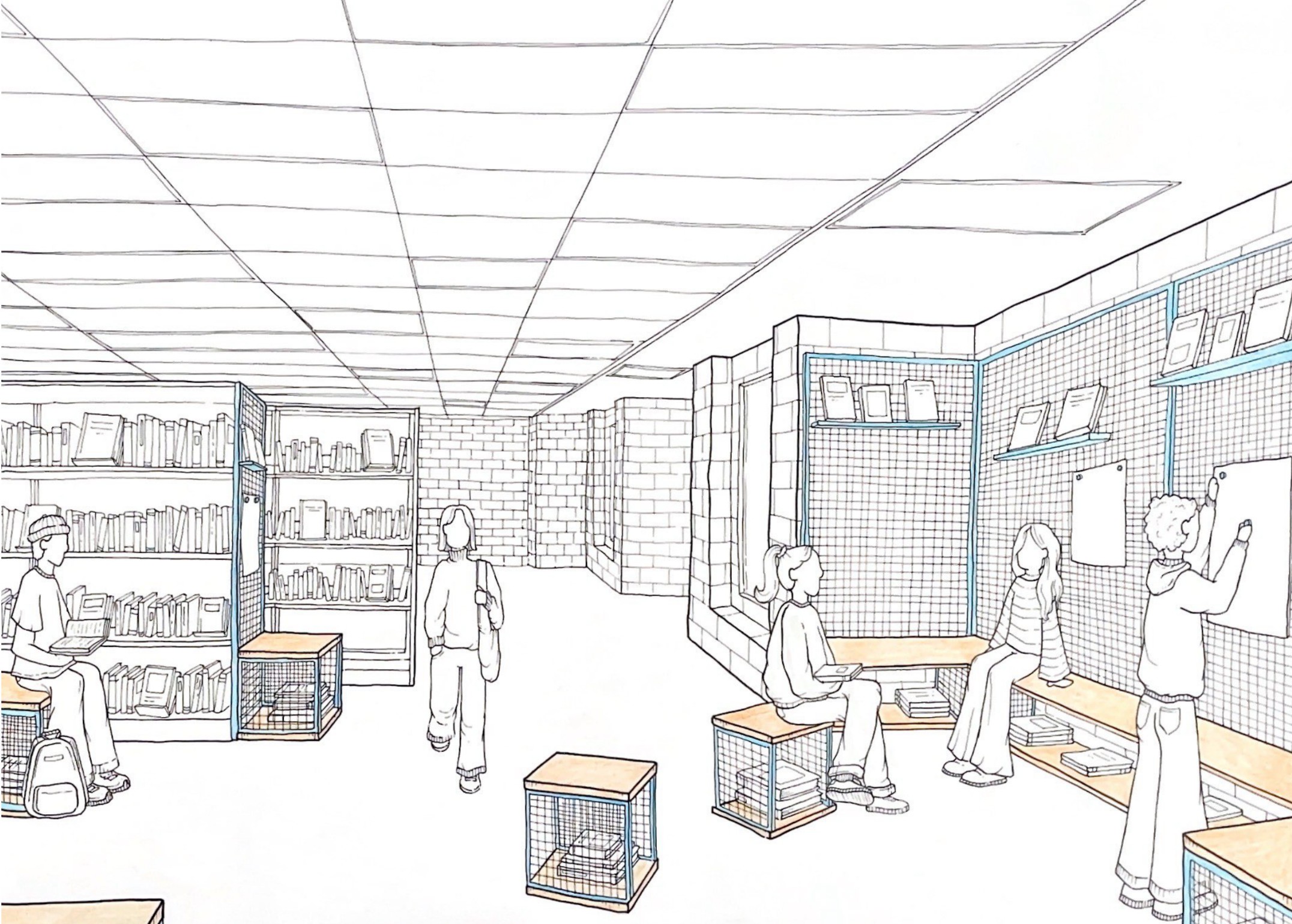 Parenthèse doit ainsi son nom à l’idée de créer une « Parenthèse », innovante, agréable et polyvalente, au cœur de la bibliothèque de l’UQAM. Nous avons imaginé des espaces d’étude, de lecture et d’exposition accessibles à tous les étudiants, notamment par la création d’un cube soutenu par une structure métallique, avec deux côtés fermés par un grillage. Cet espace permet de s’asseoir confortablement, déposer ses livres dessous et se détendre en toute simplicité. Ces grillages, se retrouvent aussi sur les côtés des étagères et dans les alcôves, offrant aux étudiants la possibilité d’exposer librement leurs travaux.