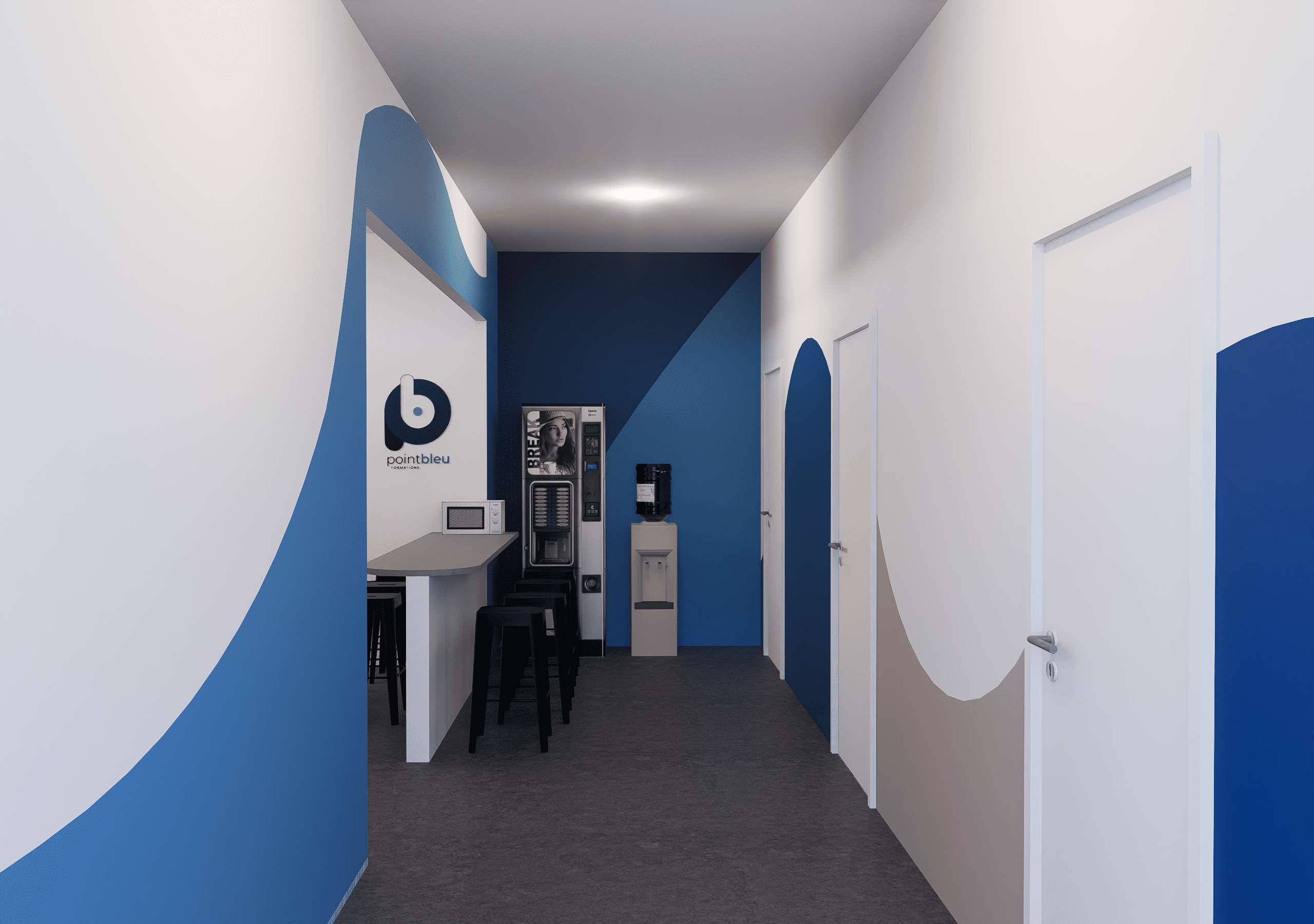 Ce projet visait à traduire la nouvelle identité de l’entreprise dans tous les espaces. En s’appuyant sur les codes graphiques et couleurs existants, chaque zone a été repensée pour faire immerger chaque personne dans l’univers de l’entreprise. À partir de croquis et concepts initiaux, plusieurs propositions ont été développées, complétées par des rendus 3D photoréalistes, permettant à tous de se projeter avant la mise en œuvre, et ainsi faciliter les échanges.